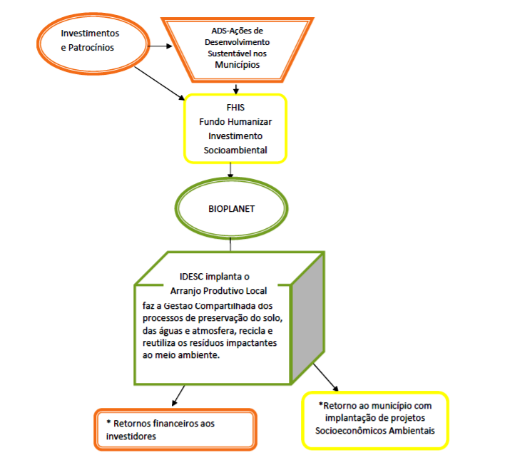 Baseada na AGENDA 2030 DA ONU sua Missão é implantar ADS's -Ações de Desenvolvimento Sustentável, para geração de resultados sociais, ambientais e econômicos de forma a garantir recursos financeiros ao FHIS -Fundo Humanizar de Investimento Socioambiental do Instituto Humanizar - IDESC, que se destinam a viabilizar a execução de suas finalidades estatutárias e prioritariamente a implantação do Processo de Desenvolvimento Socioambiental Bioplanet.