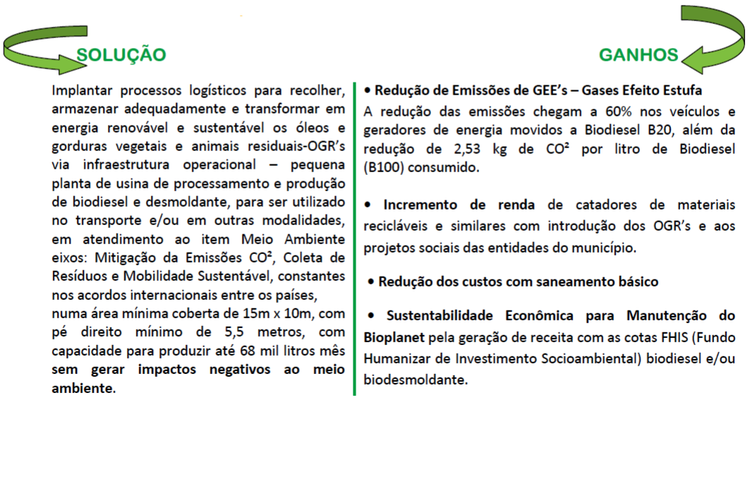 Ação de Desenvolvimento Sustentável- CIDADE BIO FELIZ -Objetivo: Fornecer tecnologias, planejamentos e modelos de negócios socioambientais para transformar problemas ambientais em soluções economicamente viáveis, ou seja, lixo e resíduos em dinheiro e desenvolvimento sustentávelSoluções: Biodigestor- converte lixo orgânico em gás de cozinha e biofertilizante; solução de saneamento básico em áreas rurais, comunidades de baixa renda, etc.Reator Plasmático- converte vinhoto (resíduo poluente da cana de açúcar), em água para reutilização nas usinas e geração de energia elétrica.Sacos de lixo biodegradáveis para minimizar os impactos ambientais em aterros e lixões.Coleta e reciclagem de restos de materiais de construção civil para transformação deste material em telhas residenciais, dentre outros. |